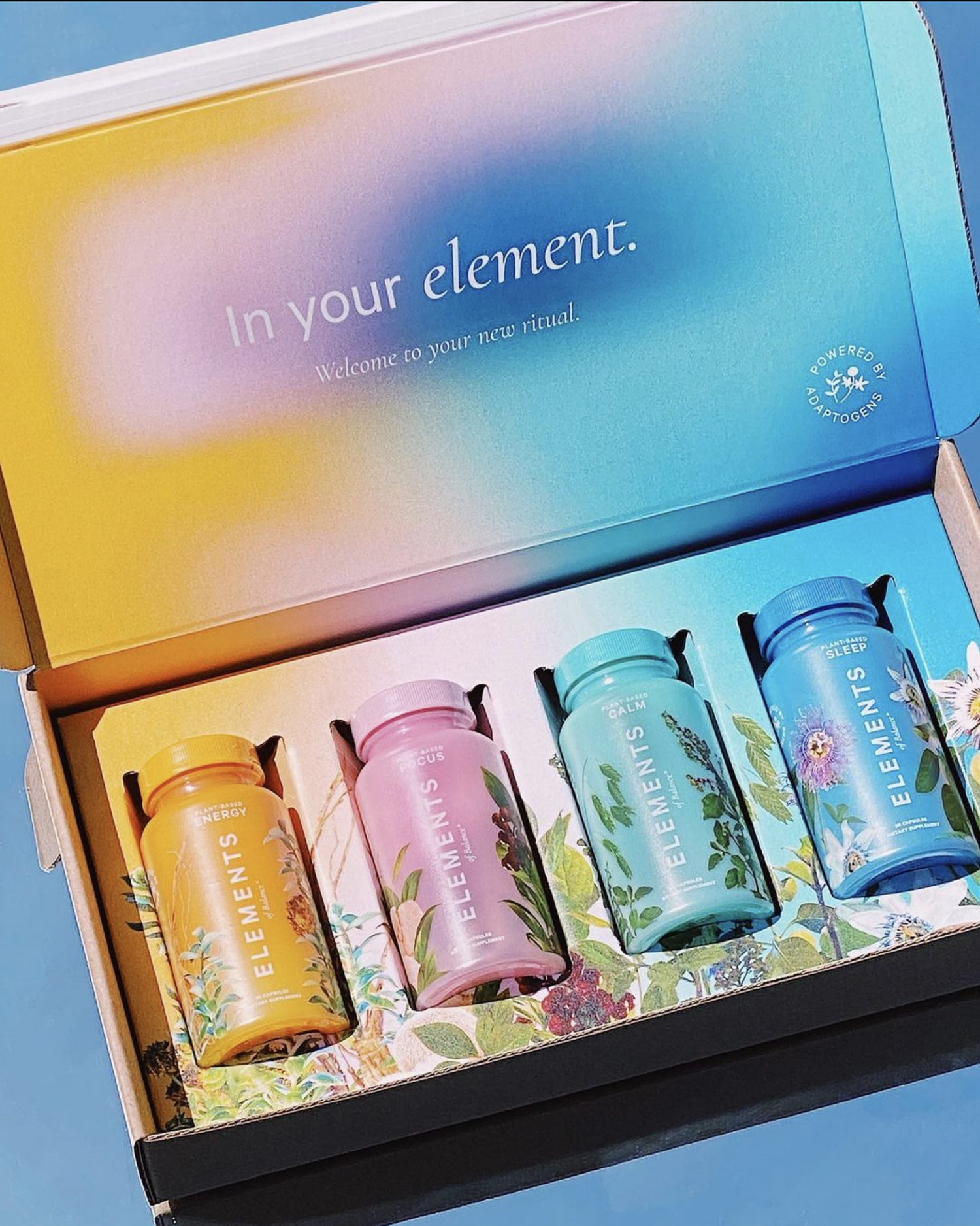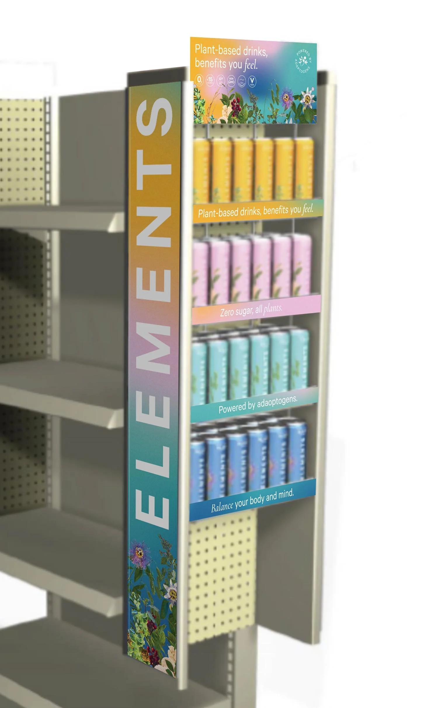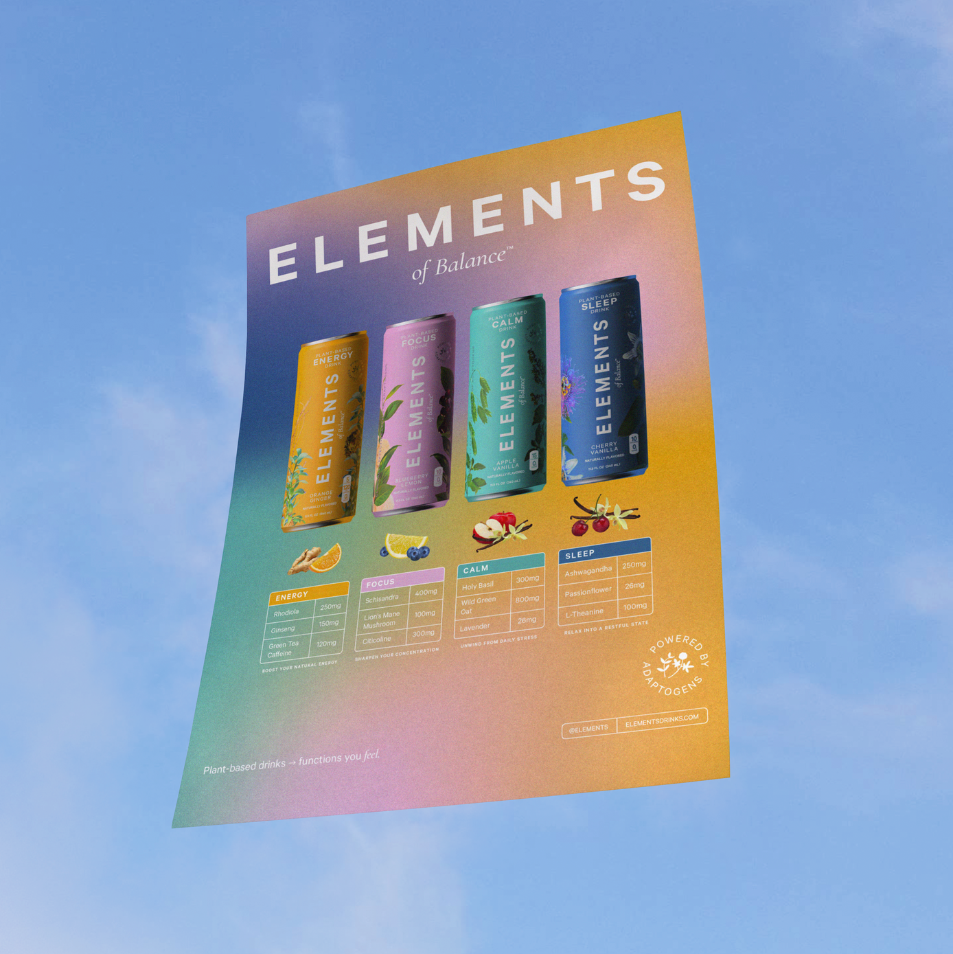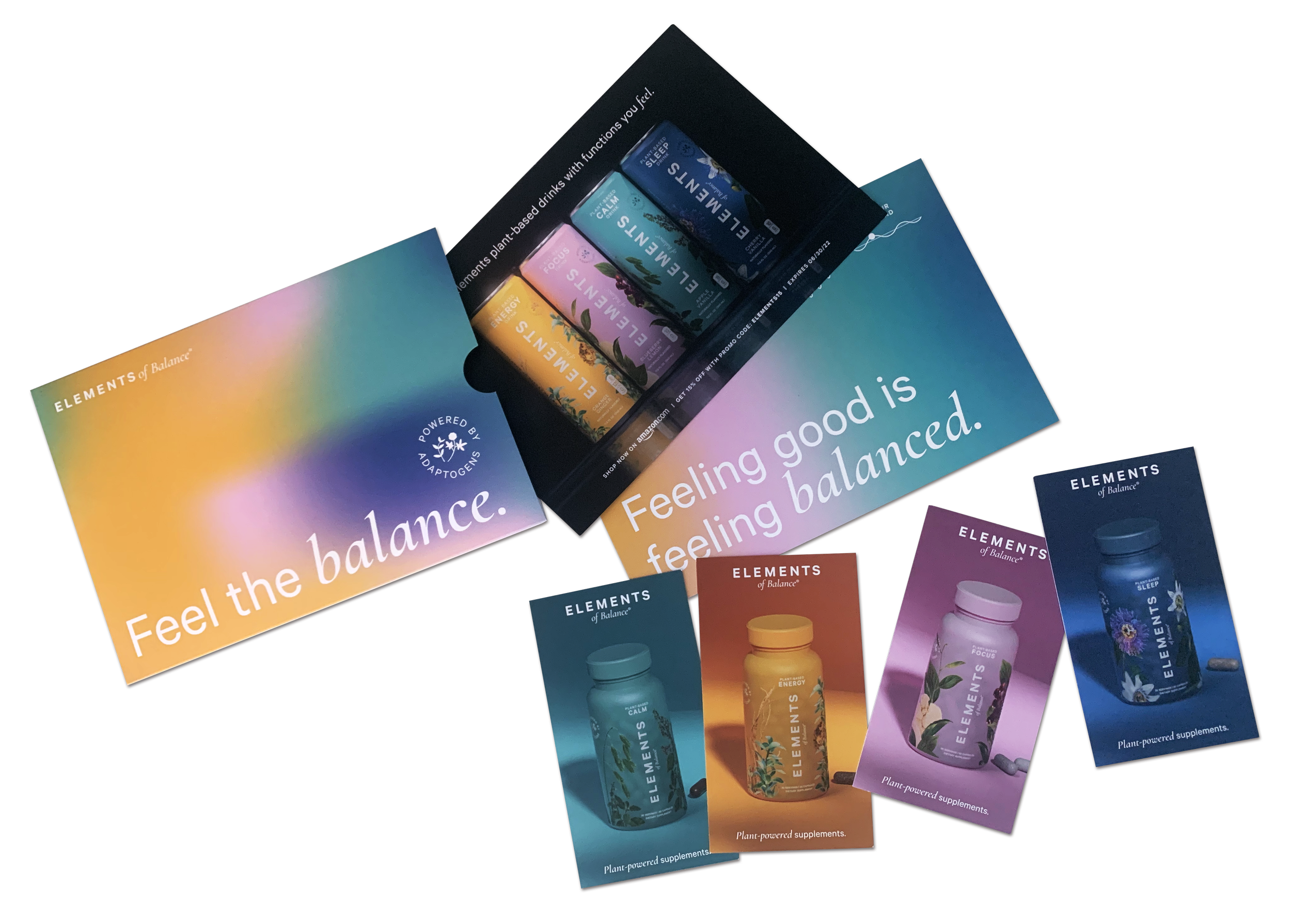 As senior designer, I helped develop and roll out the newly launched Elements of Balance brand, applying the brand to marketing materials like shippers and mailers. The drinks and supplements help with energy and focus in the a.m. and calm and sleep in the p.m. I created the custom gradient treatment which helped convey the feeling of adaptogens throughout different times of the day.