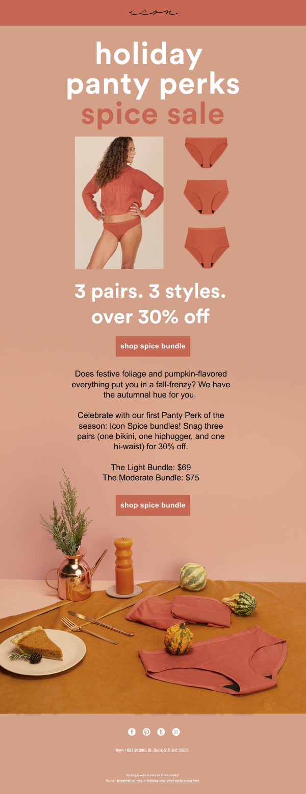 I art directed Icon’s holiday campaign, which featured a series of promotions for the underwear throughout the holiday season, starting with Thanksgiving, up to New Years. In collaboration with set designer Sara Schipani, I created a series of still lifes which place Icon underwear at the center of holiday scenes, playfully suggesting that leak-proof underwear is just as important as food, decor, and gifts to prepare for celebrations. I also directed the on-model shoot, and designed emails and web assets. The emails were plain-text emails that were coded in collaboration with a developer, so there were more constraints than a standard sliced email. Each holiday promotion got its own unique color story, united by repeating visual motifs and layout elements to form the campaign.