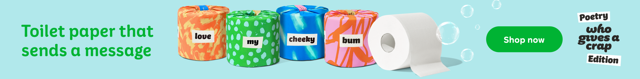 Who Gives a Crap is a sustainable toilet paper subscription brand that features yearly themed limited editions. The toilet paper is plastic free, so it comes in paper wrappers which are perfect for customizing with fun art that can be displayed in your bathroom! This limited edition was inspired by magnetic fridge poetry. The goal was to create packaging that felt highly expressive and creative, to inspire customers to play with the rolls to create poetry!