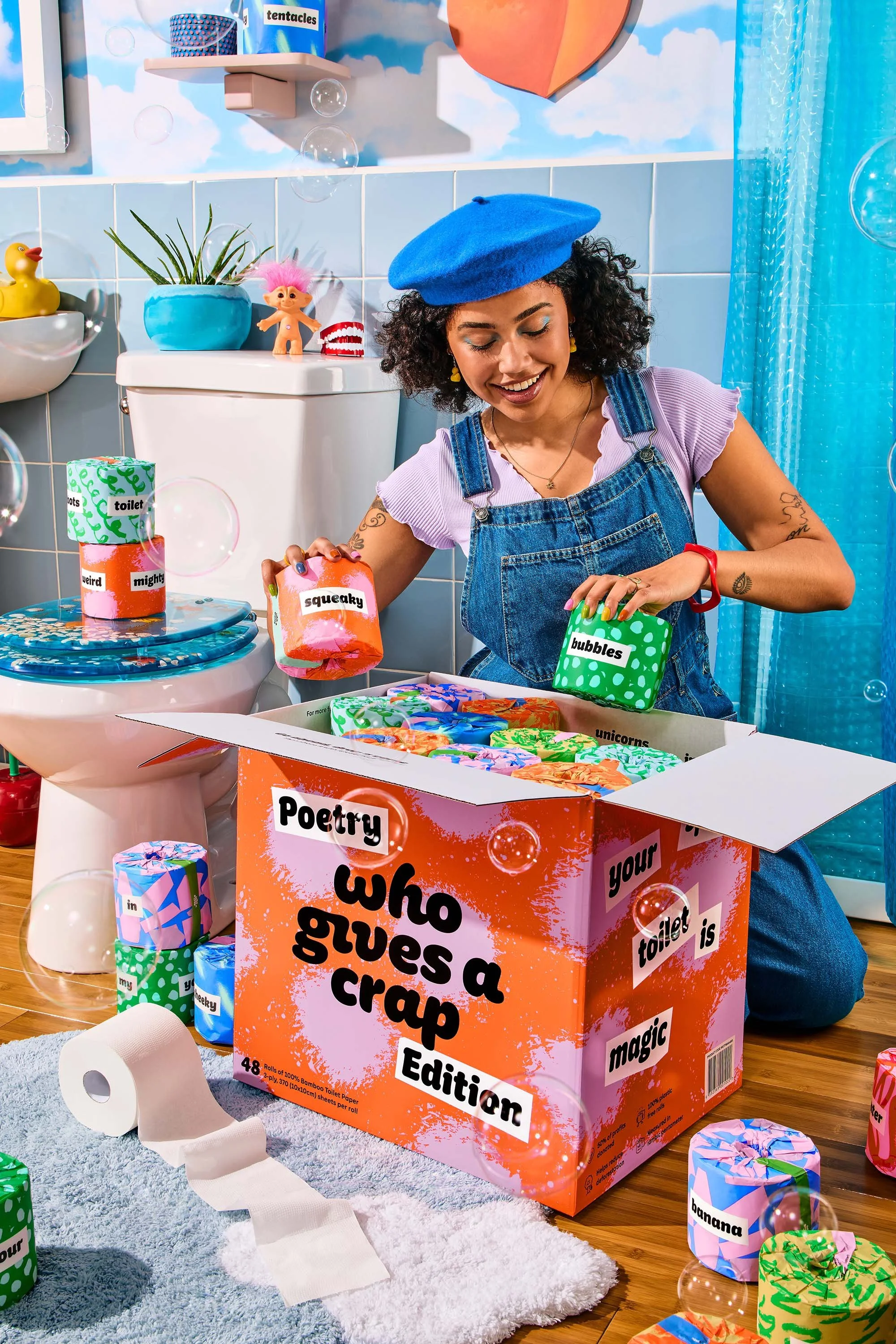 The hero persona for the shoot was the “playful poet” in a bathroom inspired by the rolls featuring the words “squeaky” and “bubbles”